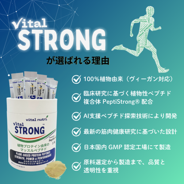 Vital STRONG is a next-generation muscle health and performance supplement powered by PeptiStrong®, a clinically researched, plant-based peptide complex derived from fava beans (Vicia faba). Developed using advanced AI, PeptiStrong® works through multiple biological pathways to promote strength, improve endurance, accelerate recovery, and support muscle health — naturally.