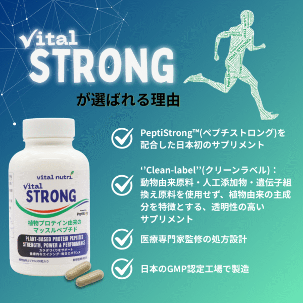 Vital STRONG™は、アイルランドの先端バイオテック企業が高度なAI技術によって発見した革新的成分「PeptiStrong®」を配合しています。臨床的エビデンスの裏付けがあり、米国FDAによるGRAS認証を取得、日本の認定GMP施設で厳格に製造されており、世界水準の品質と安全性をお届けします。