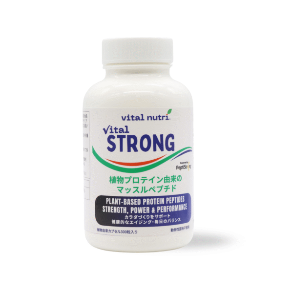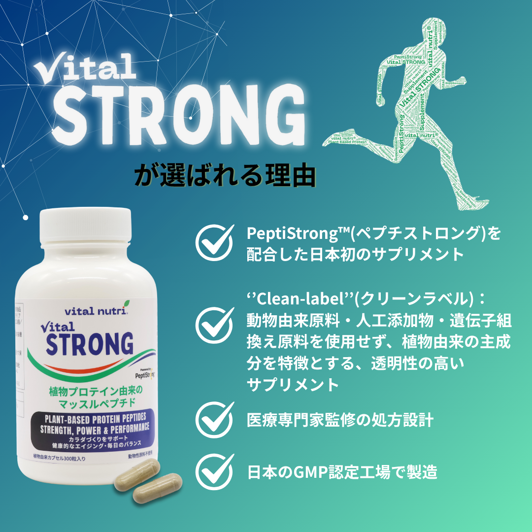 Vital STRONG™は、AI(人工知能)によって発見されたそら豆由来の生物活性プロテインペプチド「PeptiStrong®を配合した、プレミアムなデイリーサプリメントです。